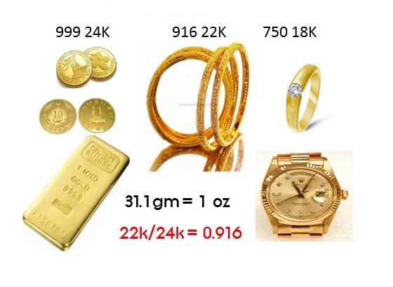 So if the gold is 22 carat with a weight of 15 grams then the pure gold content = 22/24 x 15 = 13.75 Grams.24 K = 99.9%